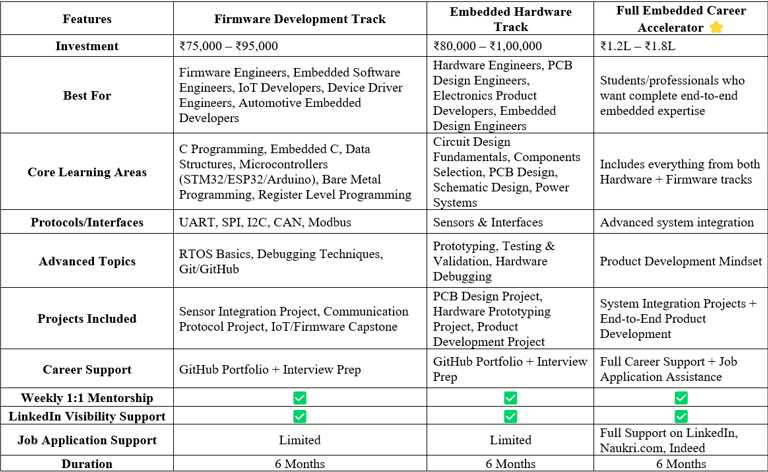 Whether you want to become a Firmware Developer, an Embedded Hardware Engineer, or a Full Stack Embedded Engineer, this program helps you go from learning → building → interviewing → getting hired.